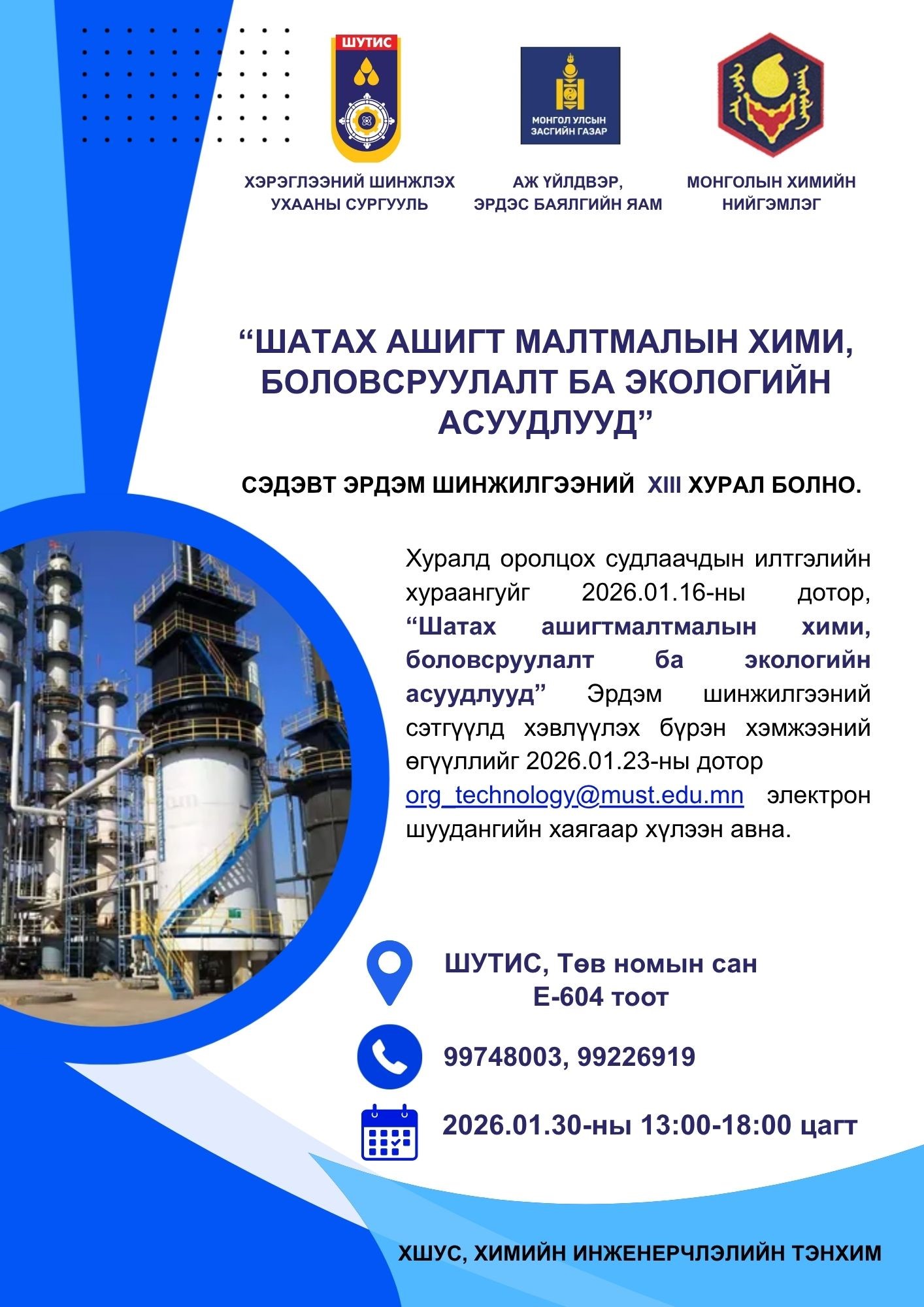 ШУТИС-ийн Хэрэглээний Шинжлэх Ухааны Сургуулийн Химийн инженерчлэлийн тэнхим, Монголын химийн нийгэмлэг, Аж үйлдвэр, эрдэс баялгийн яамтай хамтран жил бүр уламжлал болгон зохион байгуулагддаг 13 дахь удаагийн хуралд эрдэмтэн, судлаач, мэргэжилтэн, докторант, магистрант оюутан та бүхнийг өргөнөөр оролцохыг урьж байна.