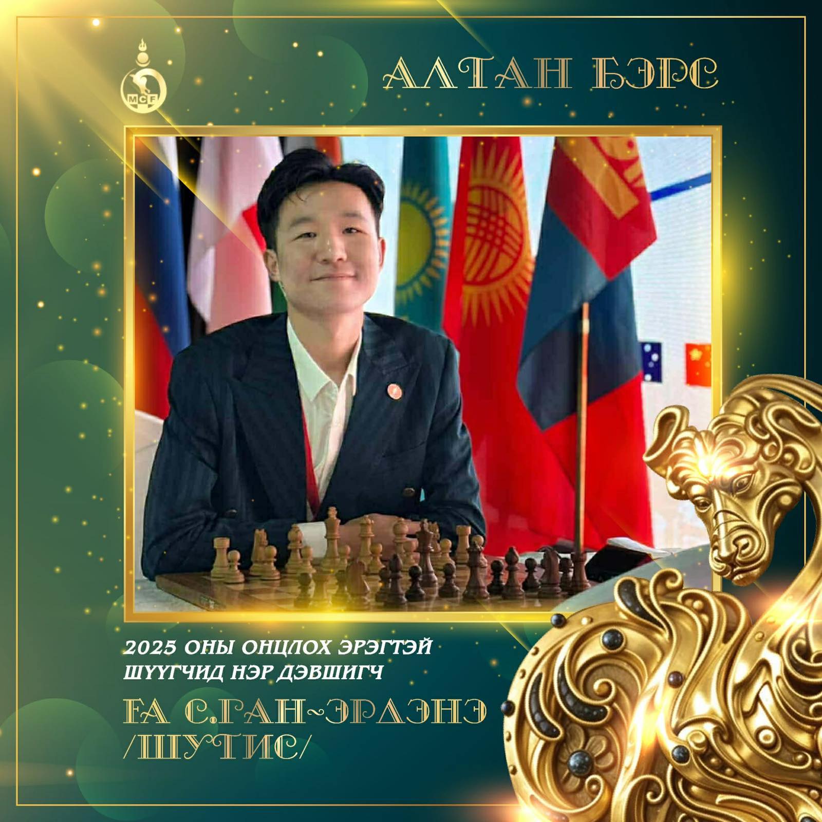 Монголын Шатрын Холбооноос нэр дэвшиж Алтан бэрс наадмын “2025 оны онцлох эрэгтэй шүүгч” шагналыг хүртсэн Л.Чойжилмаа зөвлөх багштай ГХС-ийн хятад хэлний 1-р курсийн оюутан С.Ган-Эрдэнэдээ талархал илэрхийлж цаашдын сурлага, хөдөлмөрт амжилт хүсье.