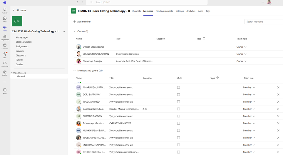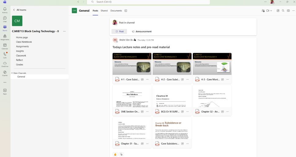 Хичээлд хэрэглэгдсэн бүх материалууд нь тэнхимд болон хөтөлбөр хариуцсан профессорт үлдэж, тус чиглэлээр суралцаж буй оюутнуудад хэрэглэгдэх боломжийг бүрдүүлэн хөтөлбөрийн хүрээнд хичээлийн материалын баялаг нөөц сан үүсэхэд тодорхой хэмжээнд ач холбогдолтой юм. Сургалтын үйл ажиллагааг 14/14-өөр орон нутагт ажиллаж буй одоогоор идэвхтэй суралцаж байгаа магистр оюунуудад боломж олгон давхар ШУТИС-ийн албан ёсны сургалтын үйл ажиллагаанд хэрэглэгдэж буй Teams-г программаар давхар цахим хэлбэрээр хамруулж, сургалтыг явуулж байна (зураг – 2,3). Andre Van As Австралийн Queensland их сургуулийн Уурхайн институтийн профессор бөгөөд салбартаа нэр хүндтэй, олон жилийн туршлагатай, онол, практик хослуулсан, сайн заах арга зүйтэй тэргүүлэх профессоруудын нэг гэж үнэлэгддэг. Уул уурхайн геотехникийн хөтөлбөрийн хүрээнд хөтөлбөрт орж буй мэргэжлийн хичээлүүдийн агуулга, зах арга зүйд тусгайлан хуваарь гаргаж, түүний дагуу мэргэжлийн багш нарт зөвлөмж өгч, сайжруулах тал дээр чиглүүлэн, дэмжин ажиллаж байна. Энэхүү магистрын хөтөлбөр нь 2020 оноос эхлэн сургалтын үйл ажиллагаа явуулж буй “Уул уурхайн геотехникийн бакалаврын хөтөлбөр”-ийн үргэлжлэл ахисан түвшний хөтөлбөр гэдгээрээ мөн онцлогтой.