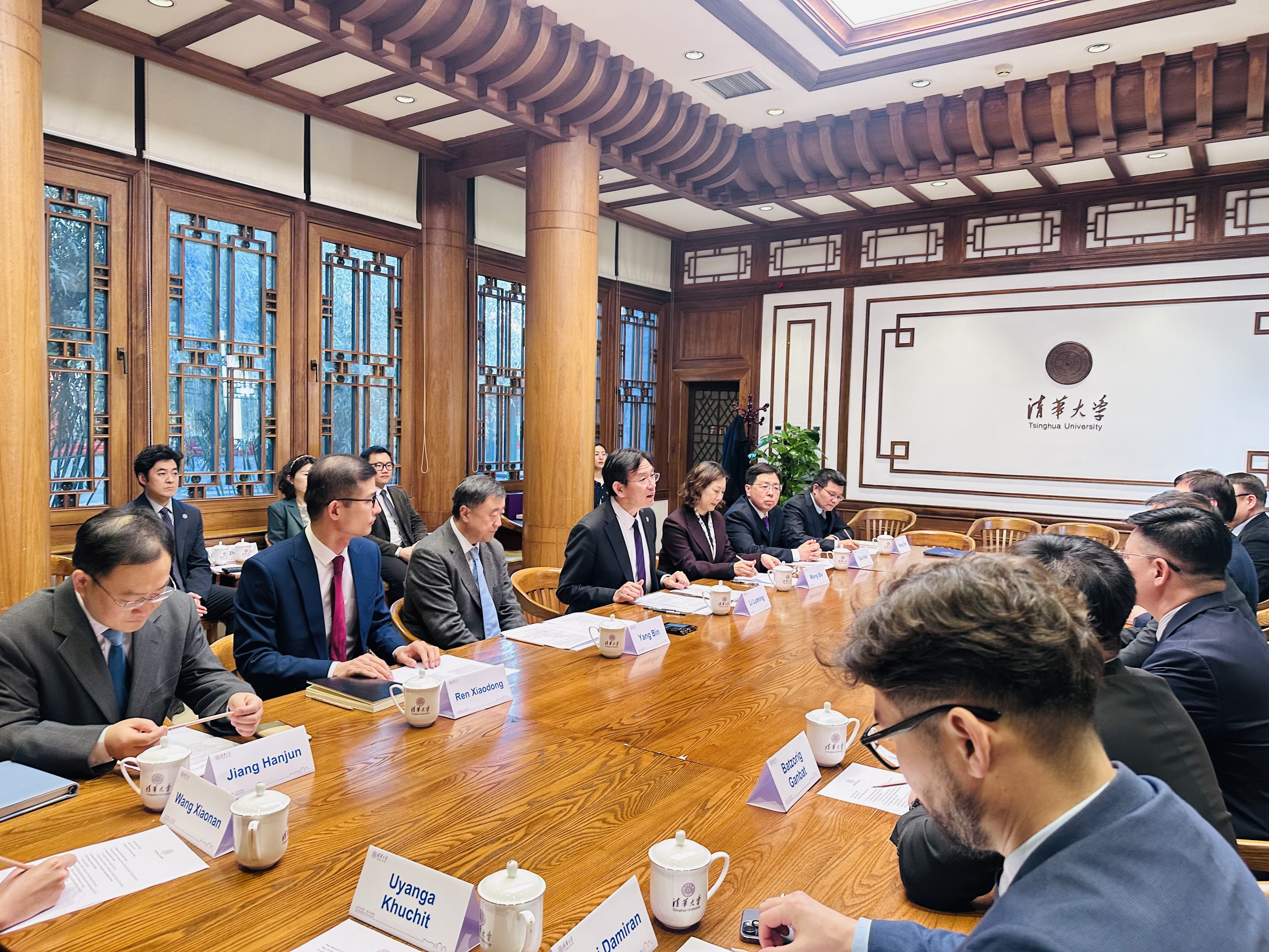 Ректор Т. Намнанг Цинхуа их сургуулийн Ерөнхийлөгч Ли Лүмин угтан авч албан уулзалтыг эхлүүллээ. Уулзалтад ШУТИС-иас Ректор Т. Намнан, ЭШИ эрхэлсэн проректор Д. Цолмонбаатар, ГХА-ны дарга Г. Батзориг, ХШУС-ийн захирал Б. Тунгалагтамир, МХТС-ийн захирал Л. Баяр-Эрдэнэ, Кибер аюулгүй байдлын тэнхимийн багш Х. Уянгаа, ЭХС-ийн захирал Б. Бат-Эрдэнэ, дэд захирал Д. Үлэмж нар, Цинхуа их сургуулиас Ерөнхийлөгч Ли Лүмин, Дэд ерөнхийлөгч Ян Бин, Олон улсын стратегийн санаачилгын албаны дарга Мэн Бо, Эрчим хүч, эрчим хүчний инженерийн тэнхимийн дэд захирал Рэн Шиаодон, Электроникийн инженерийн тэнхимийн дэд захирал Сүн Кай, Интеграл хэлхээний сургуулийн дэд захирал Жиан Ханжүн, Нүүрстөрөгчийн саармагжилтын хүрээлэнгийн дэд захирал Ван Цэ, Гадаад харилцааны албаны дэд дарга Ван Шиаонан, Гадаад харилцааны албаны Олон улсын түншлэлийн хэлтсийн ахлах менежер Цан Шин, Олон улсын судалгаа, инновацийн албаны ахлах менежер Цан Хан нар оролцлоо.
