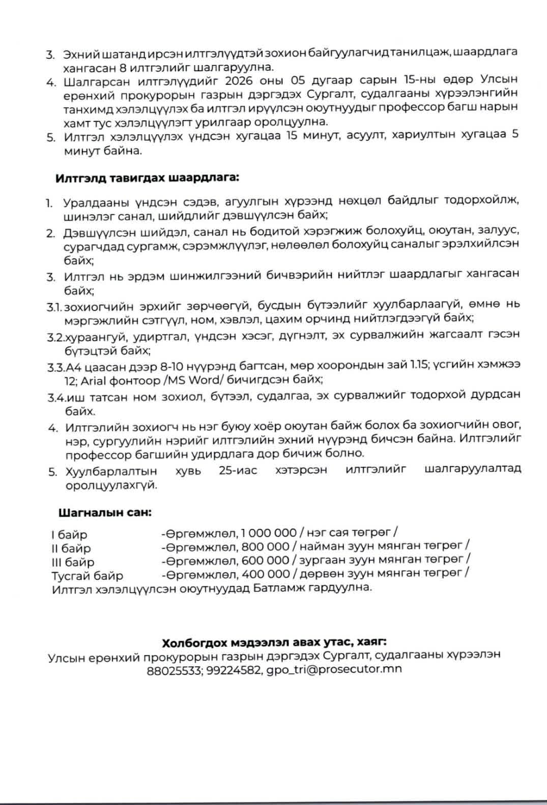 "Цахим орчин дахь хүний эрхийн хамгаалалт ба гэмт хэргээс урьдчилан сэргийлэх ажлын чиг хандлага" сэдэвт оюутны эрдэм шинжилгээний илтгэлийн уралдаан