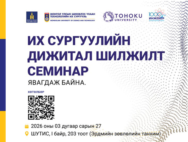 Боловсролын яам, Цахим хөгжил, инновац, харилцаа холбооны яам, Шинжлэх ухаан технологийн их сургууль, Тохоку их сургууль, MJEED төслийн хамтарсан "ИХ СУРГУУЛИЙН ДИЖИТАЛ ШИЛЖИЛТ" семинар зохион байгуулагдана.