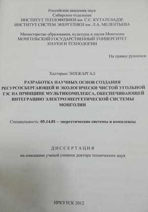 ШУТИС-ийн Сургалтын проректор Х.Энхжаргал ОХУ-ын ШУА-ийн Сибирийн салбарын Академич Л.А. Мелентьевийн нэрэмжит Эрчим хүчний системийн судалгааны хүрээлэнд Шинжлэх Ухааны доктор (Sc.D) зэрэг хамгаалсан “РАЗРАБОТКА НАУЧНЫХ ОСНОВ СОЗДАНИЯ РЕСУРСОСБЕРГАЮЩЕЙ И ЭКОЛОГИЧЕСКИ ЧИСТОЙ УГОЛЬНОЙ ТЭС НА ПРИНЦИПЕ МУЛЬТИКОМПЛЕКСА, ОБЕСПЕЧИВАЮЩЕЙ ИНТЕГРАЦИЮ ЭЛЕКТРОЭНЕРГЕТИЧЕСКОЙ СИСТЕМЫ МОНГОЛИИ” сэдэвт бүтээлээ электрон хувилбартайгаар ШУТТНомын санд хүлээлгэн өгөв.