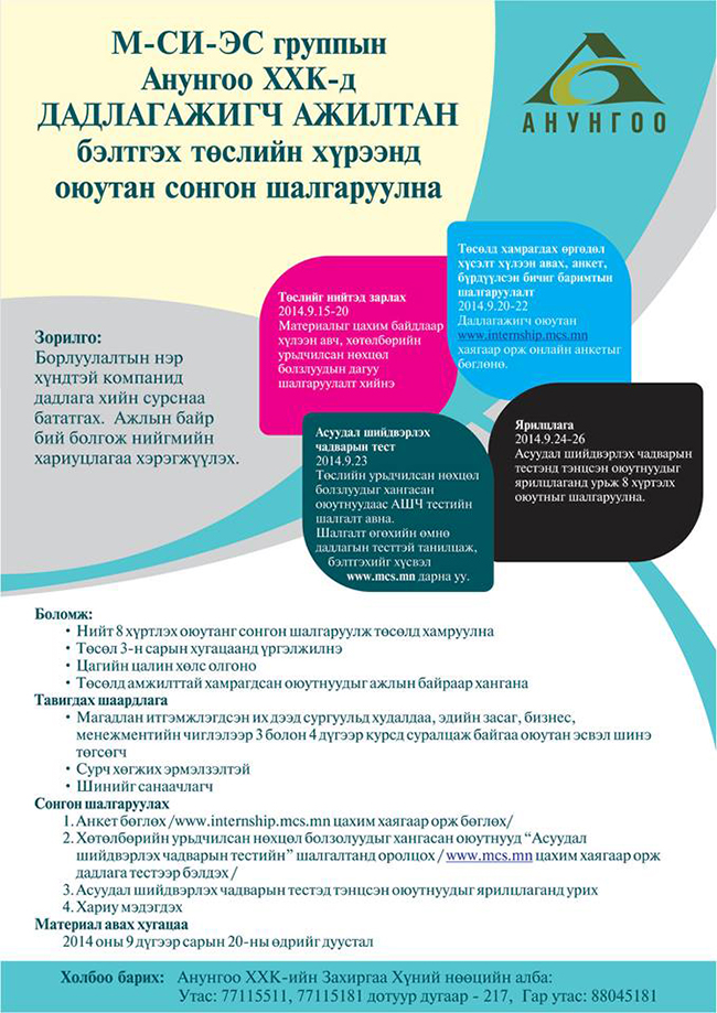 М-СИ-ЭС группын Анунгоо ХХК-д дадлагажигч ажилтан бэлтгэх төслийн хүрээнд оюутан сонгон шалгаруулна