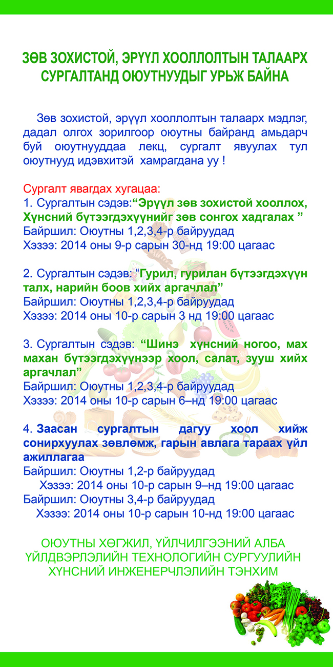 Зөв зохистой, эрүүл хооллолтын талаарх сургалтад оюутнуудыг урьж байна
