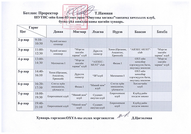 "Оюутны хөгжил" танхимд хичээллэх клуб, бусад үйл ажиллагааны цагийн хуваарь