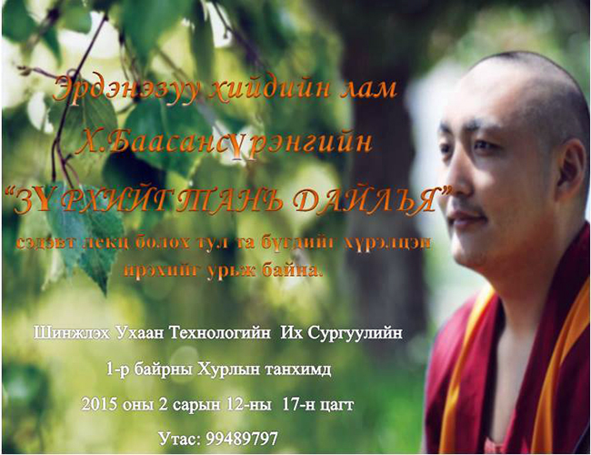 Эрдэнэзуу хийдийн лам Х.Баасансүрэн "Зүрхийг тань дайлья" сэдэвт лекц болно
