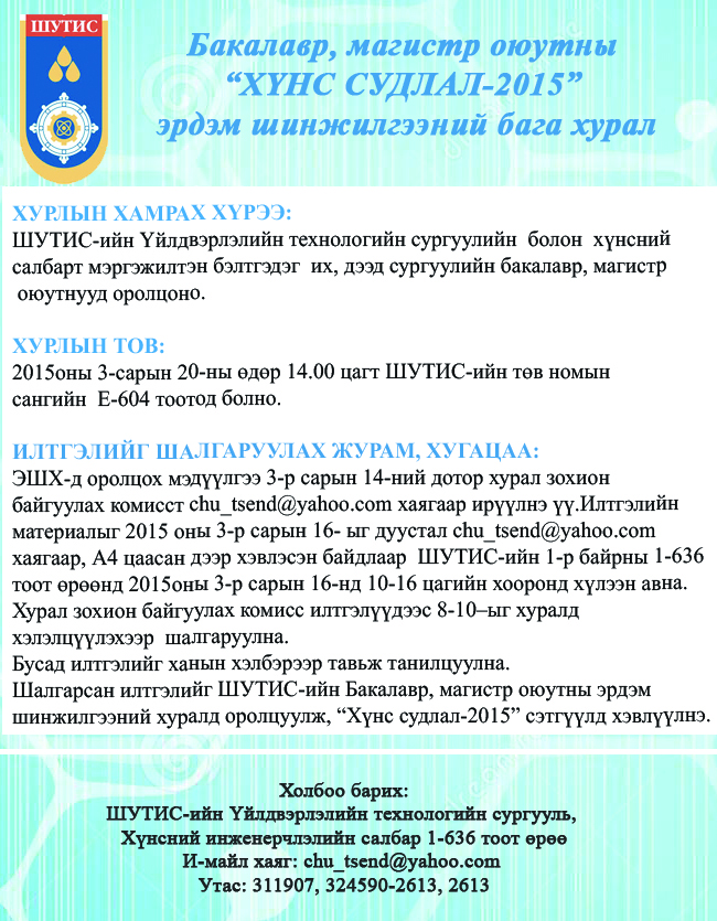 Бакалавр, магистр оюутны "Хүнс судлал 2015" эрдэм шинжилгээний бага хурал зохион байгуулна