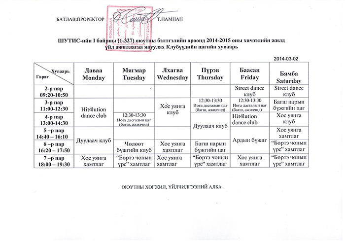 Оюутны бэлтгэлийн өрөөнд хичээллэх Клубүүдийн цагийн хуваарь