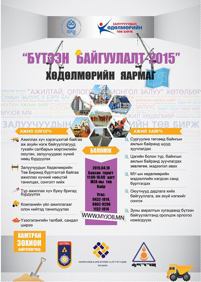 Монголын Залуучуудын Холбооноос 4-р сарыг “Бүтээх сар” болгон зарласантай холбогдуулан Залуучуудын Хөдөлмөрийн Төв Бирж 2015 оны 04-р сарын 10-ны Баасан гарагт Бүтээн байгуулалт - 2015 хөдөлмөрийн яармагийг зохион байгуулахаар төлөвлөөд байна.