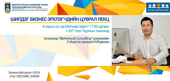 Шилдэг бизнес эрхлэгчдийн цуврал лекцийн зочноор "BizNetwork Consulting" компанийн гүйцэтгэх захирал Н.Жавхлан оролцно