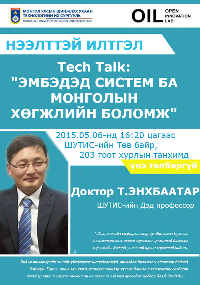 ӨНӨӨДӨР буюу 2015.05.06-нд болохоор товлогдсон байсан Tech Talk: "Эмбэдэд Систем ба Монголын Хөгжлийн Боломж" сэдэвт нээлттэй илтгэл ШУТИС-ийн нийт оюутнуудын дунд улаан бурхан өвчиний тархалт их байгаатай холбогдуулан ШУТИС-ийн Оюутны холбооноос гаргасан шийдвэрийн дагуу ТҮР ХУГАЦААГААР ХОЙШЛОХ БОЛСНЫГ МЭДЭГДЭЖ БАЙНА.