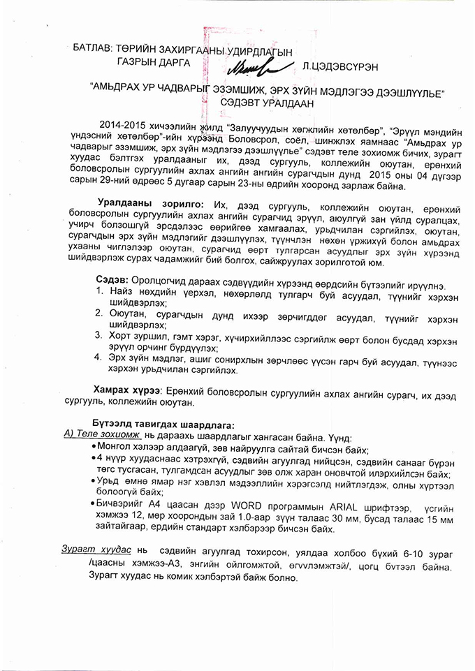 Энэхүү төсөлт ажлын хүрээнд их дээд сургууль, коллежийн оюутан, ерөнхий боловсролын сургуулийн ахлах ангийн сурагчдын дунд “Амьдрах ур чадварыг эзэмшиж, эрх зүйн мэдлэгээ дээшлүүлье”сэдэвт уралдааныг зохион байгуулах гэж байна. Уралдааны удирдамжийг дэлгэрүүлж үзнэ үү.