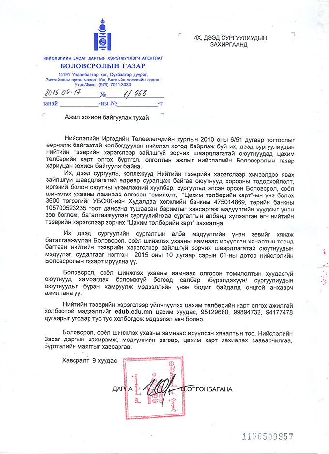 Оюутнуудад цахим төлбөрийн карт олгох тухай