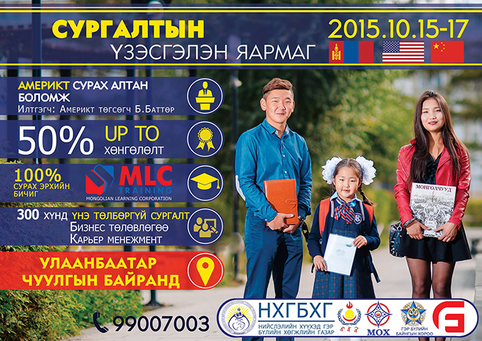 Нийслэлийн хүн амын тоо хэдийнээ нэг сая хоёр зуун мянга хол давжээ. Оюутан сурагчид, нийслэлчүүд англи, хятад хэлний боловсрол, харилцаа, олны өмнө үг хэлэх урлаг, компьютерийн мэдлэг, хүний нөөц, төслийн сургалтуудад суух хэрэгцээ өндөр болсонтой холбогдуулан Нийслэлийн хүүхэд, гэр бүлийн хөгжлийн газар, Монголын залуучуудын холбооны гэр бүлийн хороо, Монголын сурагчидын холбоо, Монголын оюутны холбоо, ГлобалИвэнтээс хамтран сургалтын төвүүдийн нэгдсэн хөнгөлөлттэй бүртгэл хийх Сургалтын үзэсгэлэн яармагийг 2015 оны 10-р сарын 15-17-ны өдрүүдэд 11:00-19:00 цагийн хооронд Нийслэлийн Улаанбаатар чуулгын байрны 2 давхарт зохион байгуулна. Тус үзэсгэлэн яармагт ирсэнээр томоохон нэр хүнд бүхий сургалтын төвүүдэд 50% хүртэлх хөнгөлөлттэй хамрагдах боломжтой. Арга хэмжээний үеээр Америкт суралцах алтан боломж сэдвээр Америкт төгсөгч Баттөр лекц тавиж, Монголын лектор төвүүс азтай хүнд 100% хөнгөлөлтийн эрхийн бичгээ бэлэглэж, Хүний нөөцийн цалин хөлс, сонгон шалгаруулалт, кареар төлөвлөлт зэрэг сэдвүүдээр үнэ төлбөргүй лекц, 300 хүн сертифкаттай сургалтын 100% тэтгэлэг, Номын хямдралтай худалдаа, Хуучин ном худалдан авах өдөрлөг зэрэг олон сонирхолтой арга хэмжээнүүд болно. Нийслэлчүүд та бүхэн гэр бүл найз нөхөд, анги хамт олноороо хүрэлцэн ирж хөнгөлөлтөө аваарай. Улаанбаатар чуулгын байр төв усан бассейны дэргэд байдаг шүү. Лавлах утас: 9900-7003