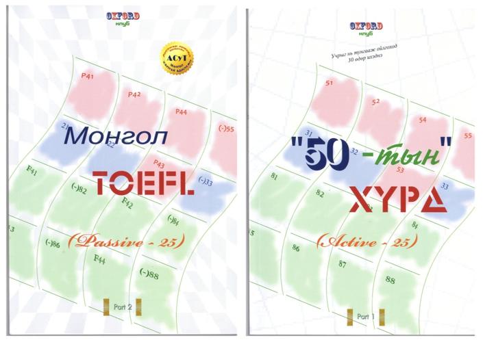 Сургалтанд хэрэглэх Монгол TOEFL” буюу “50-тын хүрд” сурах бичгийн онцлог нь 50 өгөгдэхүүнтэй бодлого доторхи логик холбоосыг англи монгол 2 хэлний дүрмийг нягт харьцуулах замаар схемчлэн харуулсанаараа онцлог юм. Уг сурах бичгийн үнэ: 22000 төгрөгийн үнэтэй.