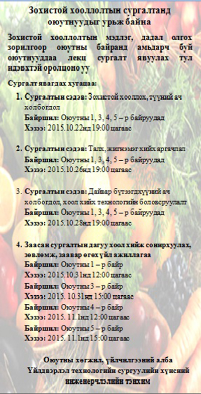 Зохистой хооллолтын сургалтад оюутнуудыг урьж байна