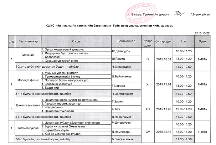 Физик-1 хичээлээр тойм лекц уншиж, семинар хийх тул тус хичээлийг судалж буй оюутнууд доорх хуваарийн дагуу хичээлд өргөнөөр оролцоно уу