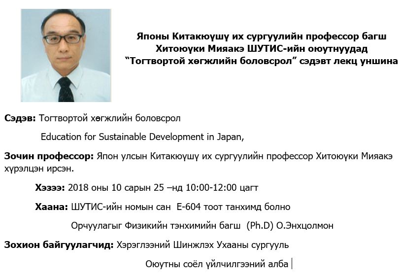 Японы Китакюүшү их сургуулийн профессор багш Хитоюүки Мияакэ ШУТИС-ийн оюутнуудад “Тогтвортой хөгжлийн боловсрол” сэдэвт лекц уншина