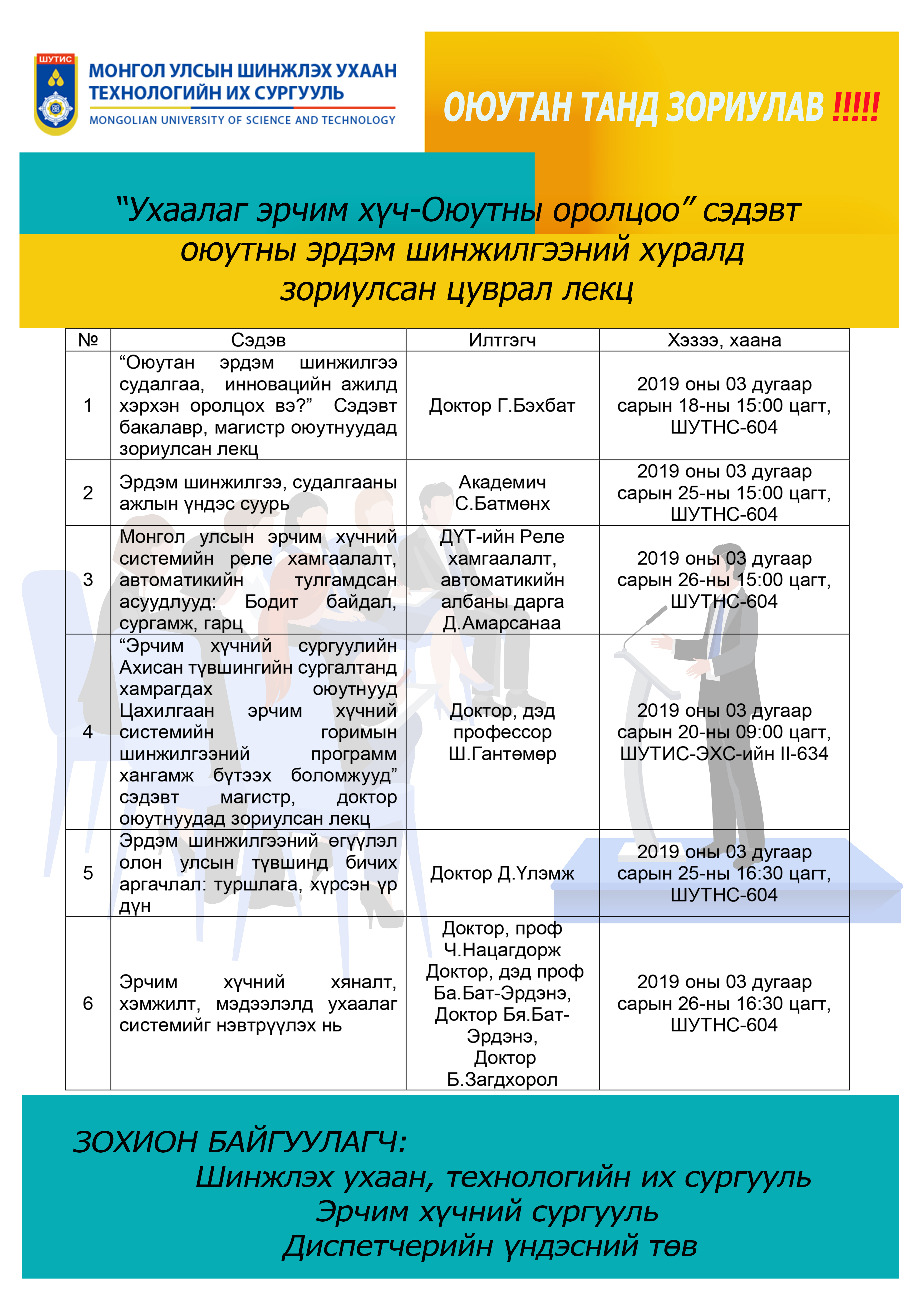 "Ухаалаг эрчим хүч-Оюутны оролцоо" сэдэвт оюутны эрдэм шинжилгээний хуралд зориулсан цуврал лекц