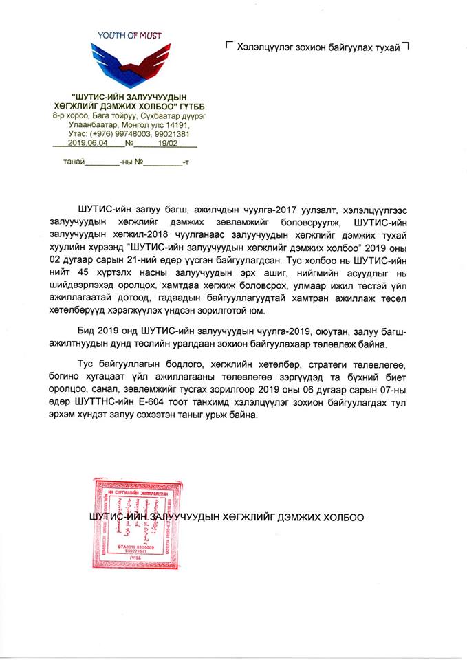 ШУТИС-ийн залуучуудын хөгжлийг дэмжих холбооноос тус байгууллагын бодлого, хөгжлийн хөтөлбөр, стратеги төлөвлөгөө, богино хугацаат үйл ажиллагааны төлөвлөгөө зэргүүдэд та бүхний биет оролцоо, санал, зөвлөмжийг тусгах зорилгоор 2019 оны 06 дугаар сарын 07-ны өдрийн 9 цагт ШУТТНС-ийн Е-604 тоот танхимд хэлэлцүүлэг зохион байгуулагдах тул эрхэм хүндэт залуу сэхээтэн таныг урьж байна.