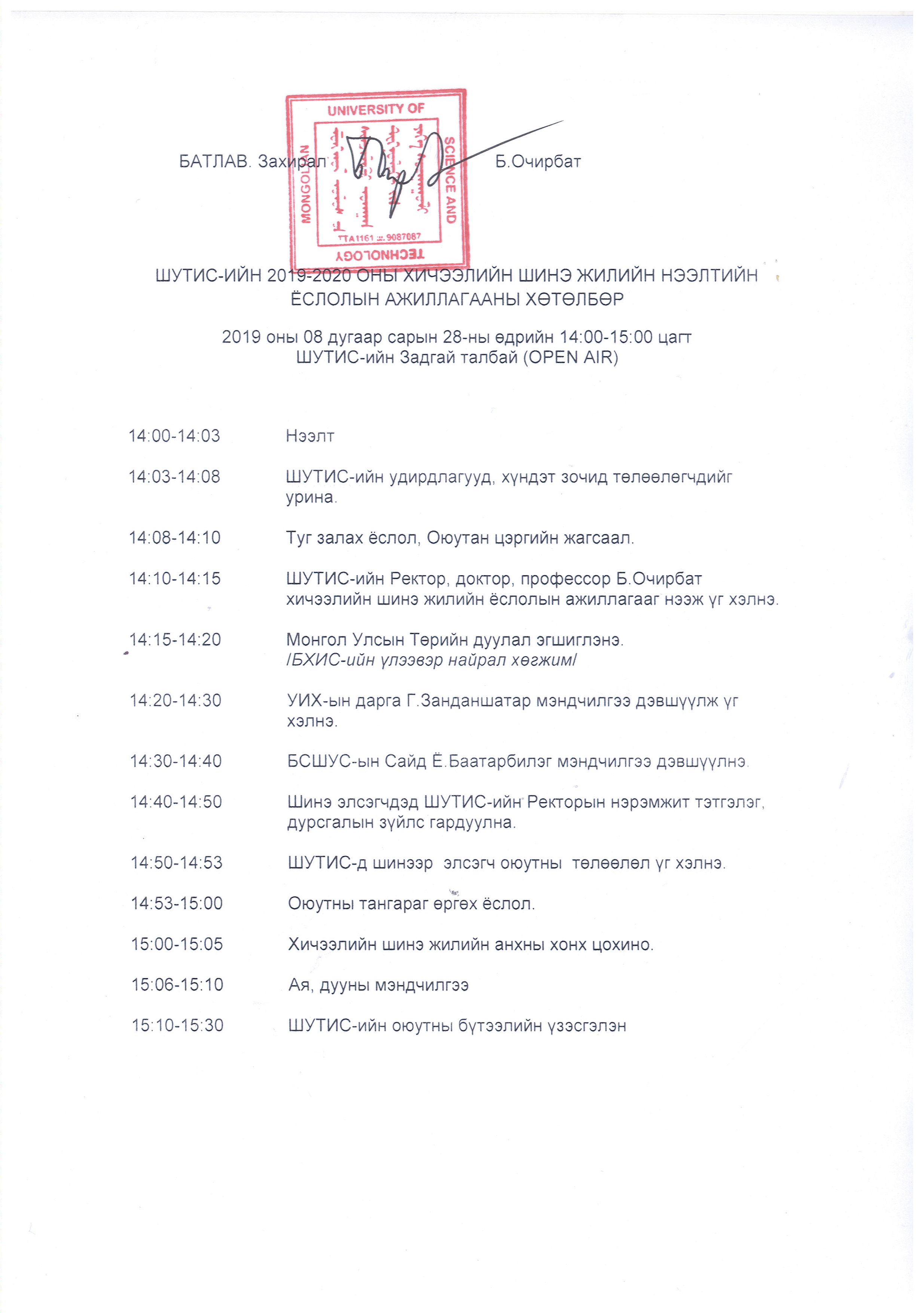 ШУТИС-ийн 2019-2020 оны хичээлийн шинэ жилийн нээлтийн ёслолын ажиллагааны хөтөлбөр