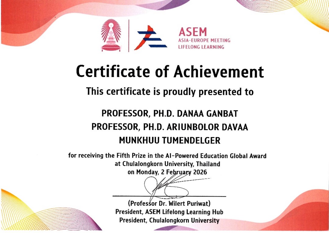 The research project entitled “Human-Centered Artificial Intelligence in Higher Education: Reinterpreting Student Engagement, Well-Being, and Continuity through a Hierarchical Maslow 2.0 Framework,” jointly conducted by Professor Ariunaa Khashkhuu from the School of Management of MUST, Professor Tudevdagv Uranchimeg from the School of Advanced Studies, and Senior Lecturer Ch. Nyambayar from the School of Management, participated in the competition and received a “Participation Appreciation” recognition among the international participants.