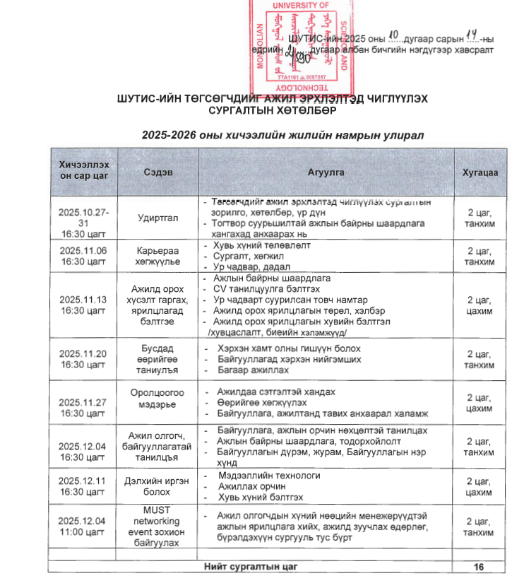 Энэ өдөр ШУТИС-ийн төгсөгчдөд “Ажил эрхлэлтэд чиглүүлэх сургалт”-ийг 2025 оны 10 дугаар сарын 11-нээс 12 дугаар сарын 11-нийг хүртэл зохион байгуулсан ба тус сургалтад нийт 199 оюутан хамрагдсанаас 8 оюутан сургалтын батламж авах болзол хангасан. Эдгээр оюутнуудын төлөөлөлд батламж олголоо. Батламжийг ахлах мэргэжилтэн Ц.Болдбаатар, MSDI Pro-HR консалтинг группийн сургагч багш Т.Тэрбиш нар гардуулж өгсөн. Батламж авсан оюутнуудад цаашдын боломж, төсөл хөтөлбөрт хамтран ажиллах талаар тусгайлан танилцууллаа.