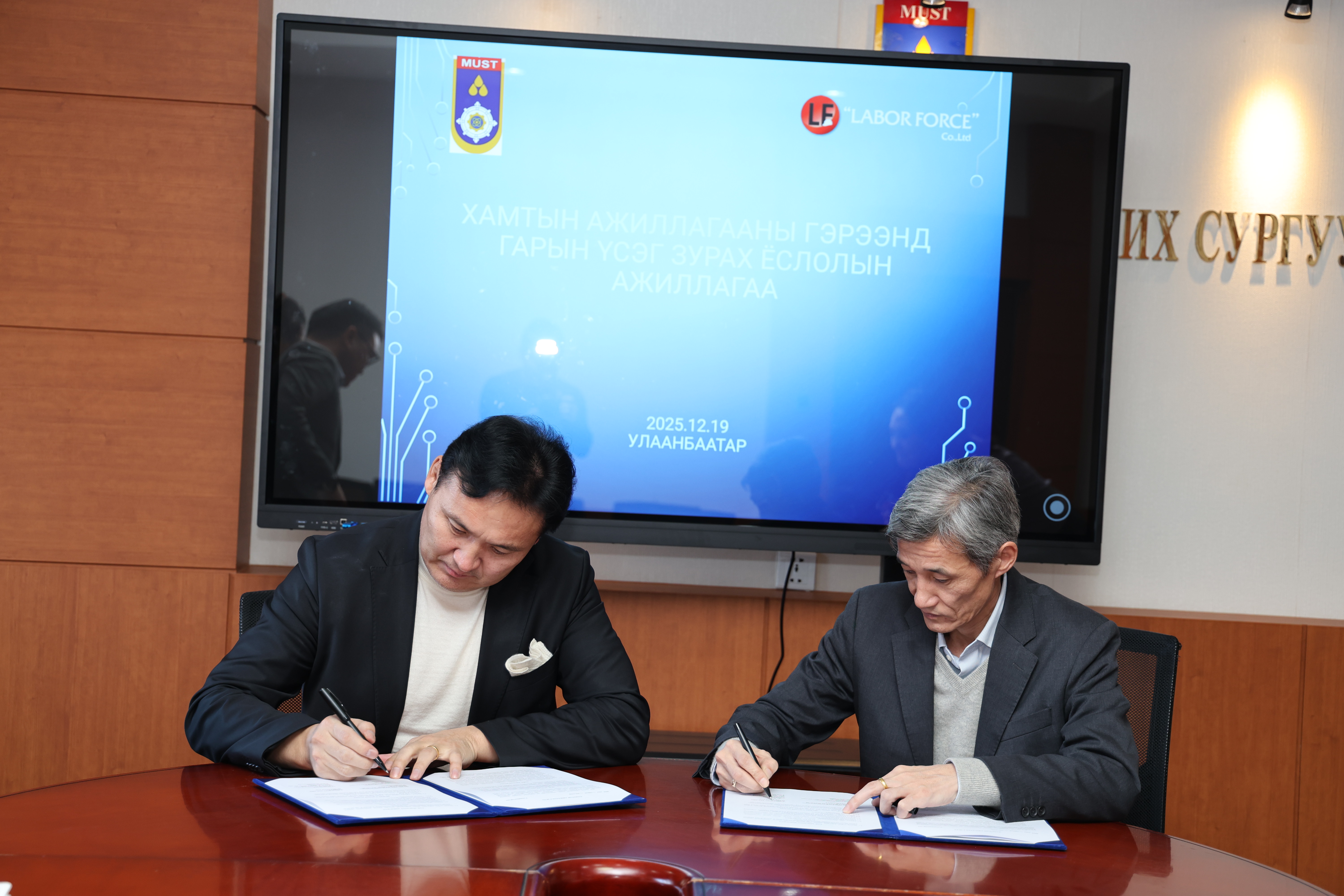 ШУТИС-ийн Хөгжлийн бодлого, дижитал шилжилт эрхэлсэн проректор, Р. Бадмаанямбуу болон “Лэйбор форсе” ХХК-ийн захирал М.Чимэдтогтох нар Япон улсад ШУТИС-ийн оюутнуудыг кредиттэй, цалинтай дадлага хийлгэх хамтын ажиллагааны гэрээнд 2025 оны 12 дугаар сарын сарын 19-ний өдөр гарын үсэг зурлаа. Уулзалтад Гадаад харилцааны даргын үүрэг гүйцэтгэгч Г.Батзориг, “Лэйбор форсе” ХХК-ийн ерөнхий менежер Б.Чулуунцэцэг нар байлцав.