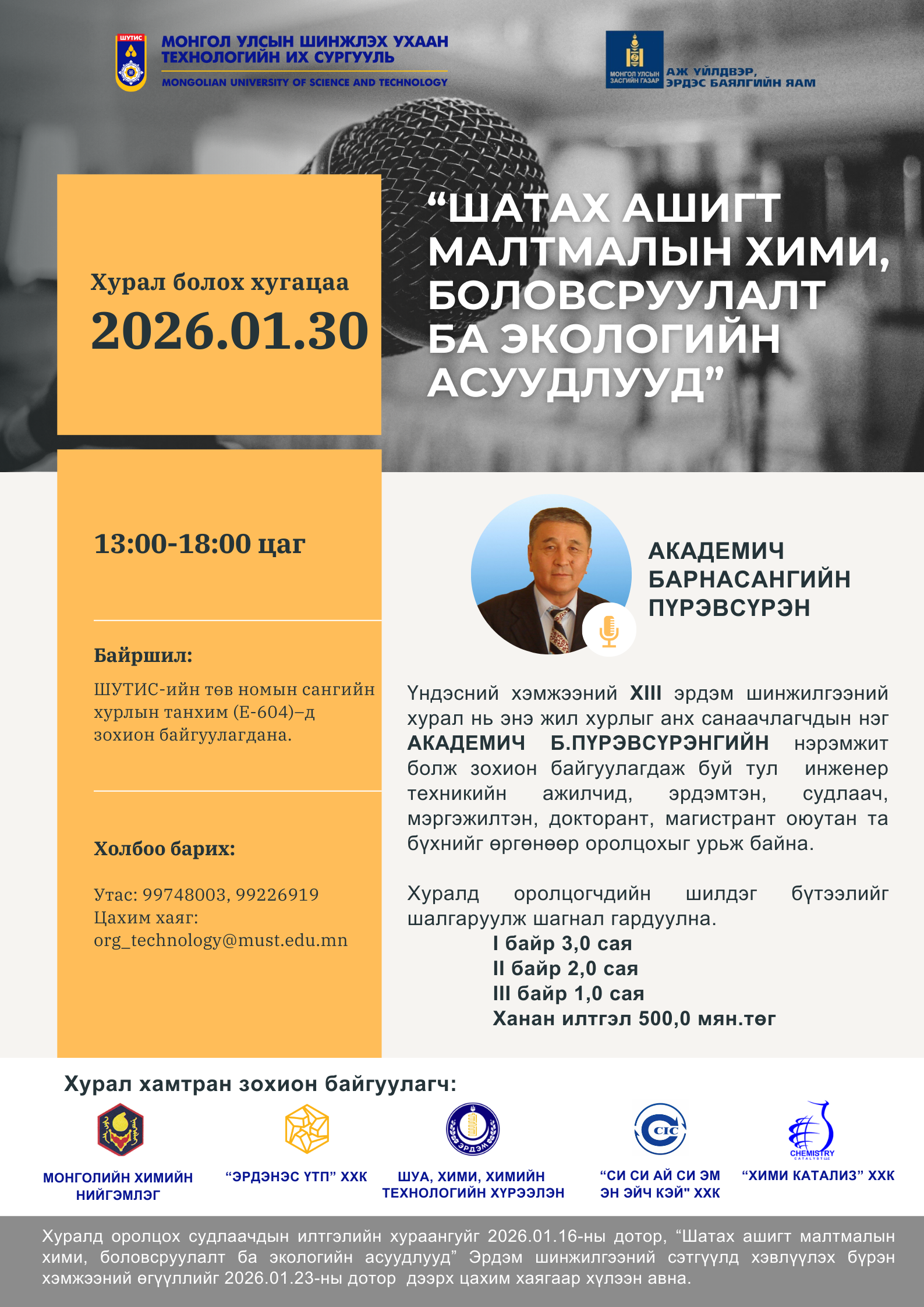 Шинжлэх Ухаан Технологийн Их Сургуулийн харьяа Хэрэглээний Шинжлэх Ухааны Сургуулийн Химийн инженерчлэлийн тэнхимээс Монголын химийн нийгэмлэг, Аж үйлдвэр, эрдэс баялгийн яамтай хамтран жил бүр уламжлал болгон зохион байгуулагддаг 13 дахь удаагийн “Шатах ашигт малтмалын хими, боловсруулалт ба экологийн асуудлууд” сэдэвт эрдэм шинжилгээний хурал нь энэ жил Академич Б.Пүрэвсүрэнгийн нэрэмжит болж зохион байгуулагдаж буй тул инженер техникийн ажилчид, эрдэмтэн, судлаач, мэргэжилтэн, докторант, магистрант оюутан та бүхнийг өргөнөөр оролцохыг урьж байна. Хурал 2026 оны 01 дүгээр сарын 30-ны өдөр 13:00 цагт ШУТИС-ийн төв номын сангийн хурлын танхим (Е-604)–д зохион байгуулагдана. Дараах линк дээр дарж ЭРДЭМ ШИНЖИЛГЭЭНИЙ ӨГҮҮЛЭЛ БИЧИХ ЗААВАР-тай танилцаарай.