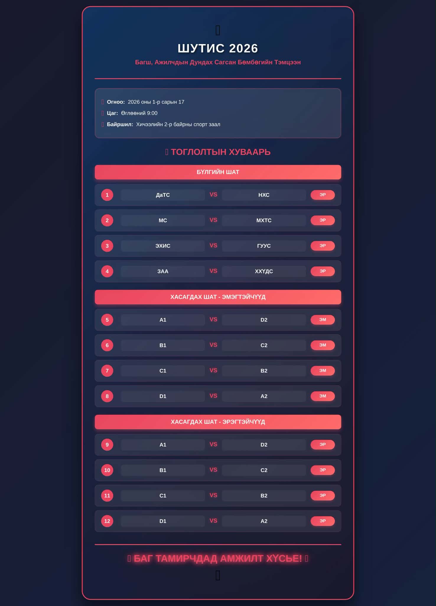 Сагсан бөмбөгийн тэмцээний бүх тоглолтууд ШУТИС-ийн төв байрны спорт зааланд зохион байгуулагдах тул оролцогчид болон сонирхогчид тоглолтын байршлыг анхаарч, цагийн хуваарийн дагуу оролцохыг хүсье.