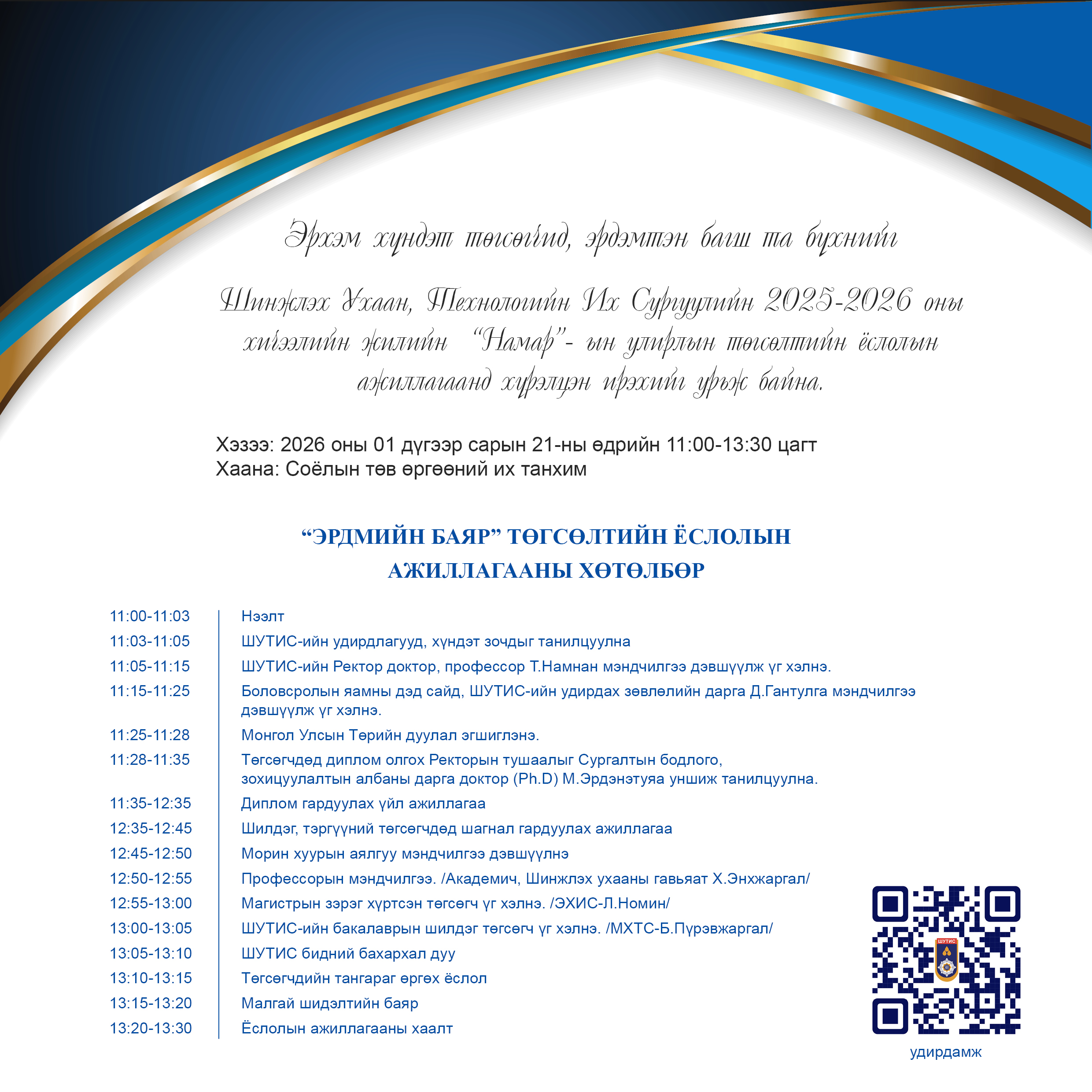 ШУТИС-ийн 2025-2026 оны хичээлийн жилийн намрын улирлын "Эрдмийн баяр" төгсөлтийн ёслолын ажиллагааны удирдамж