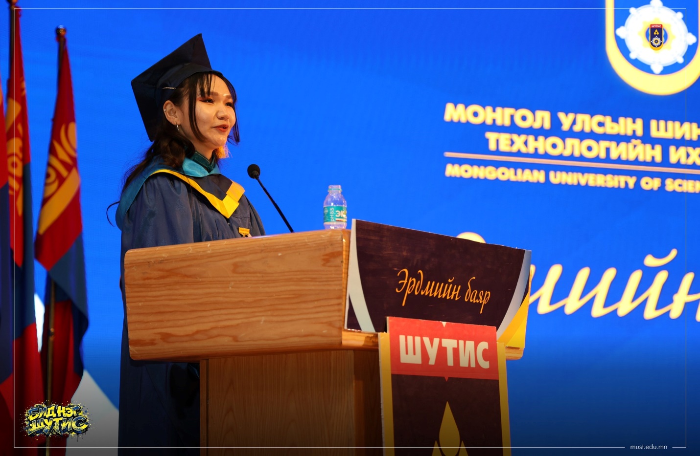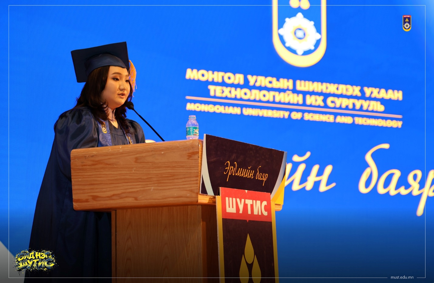 Магистрын төгсөгчдийг төлөөлөн эрчим хүчний инженерчлэлийн сургуулийн Цахилгаан системийн автоматжуулалт хөтөлбөрийн магистр Л.Номин, бакалаврын шилдэг төгсөгчдийг төлөөлж Мэдээлэл холбооны технологийн сургуулийн Мэдээллийн систем хөтөлбөрөөр төгсөгч Б.Пүрэвжаргал нар эрдэмтэн багш нар, гэр бүл, найз нөхөд ,зочид төлөөлөгчдөдөө хандан баярлаж, талархсан талархлын үгээ хэллээ.