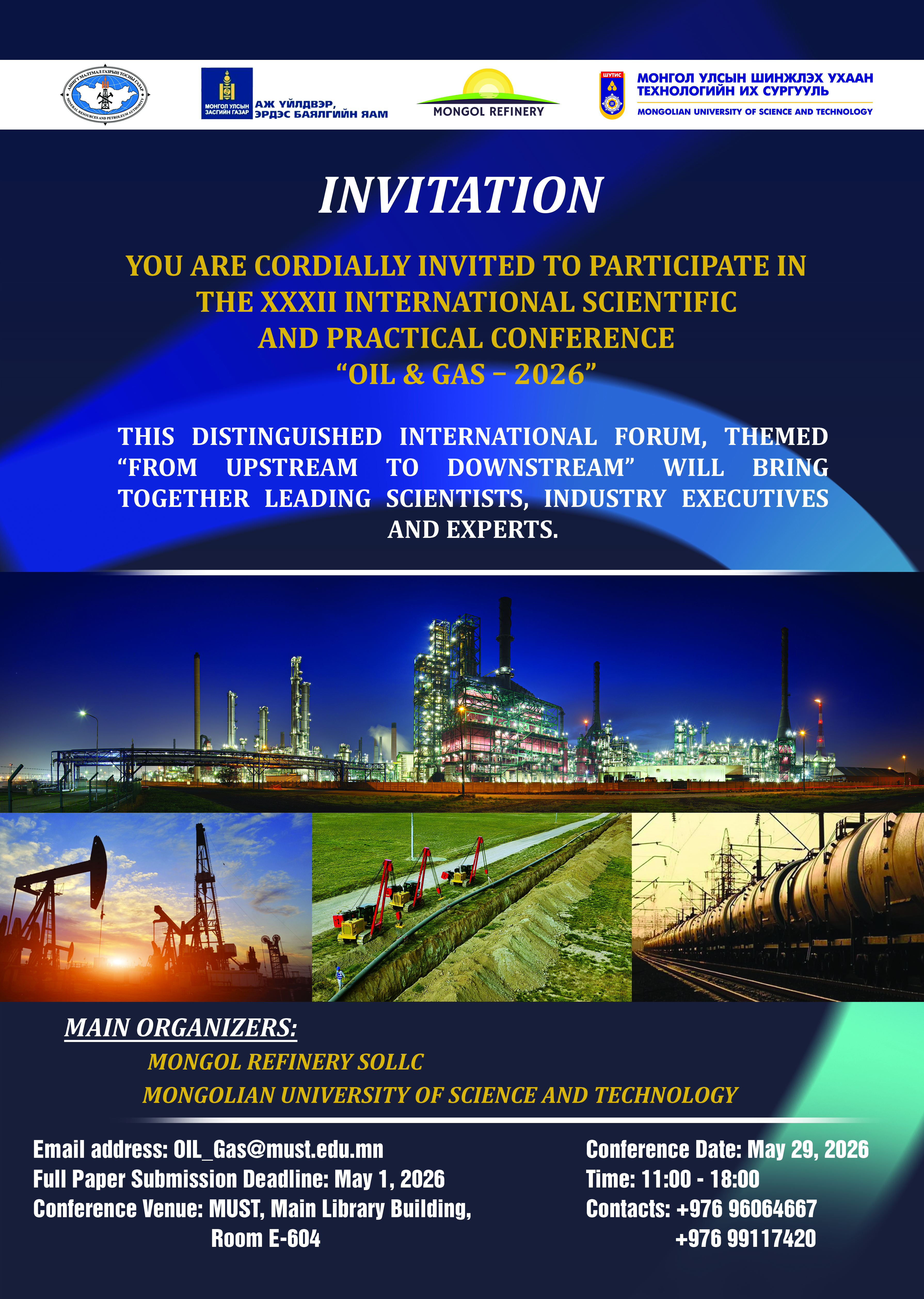 Хуралд илтгэл, өгүүлэл хүлээн авах хугацаа: 2026 оны 5 дугаар сарын 01-ний өдрийн 14 цагийн дотор OIL_GAS@must.edu.mn хаягаар илгээнэ үү.