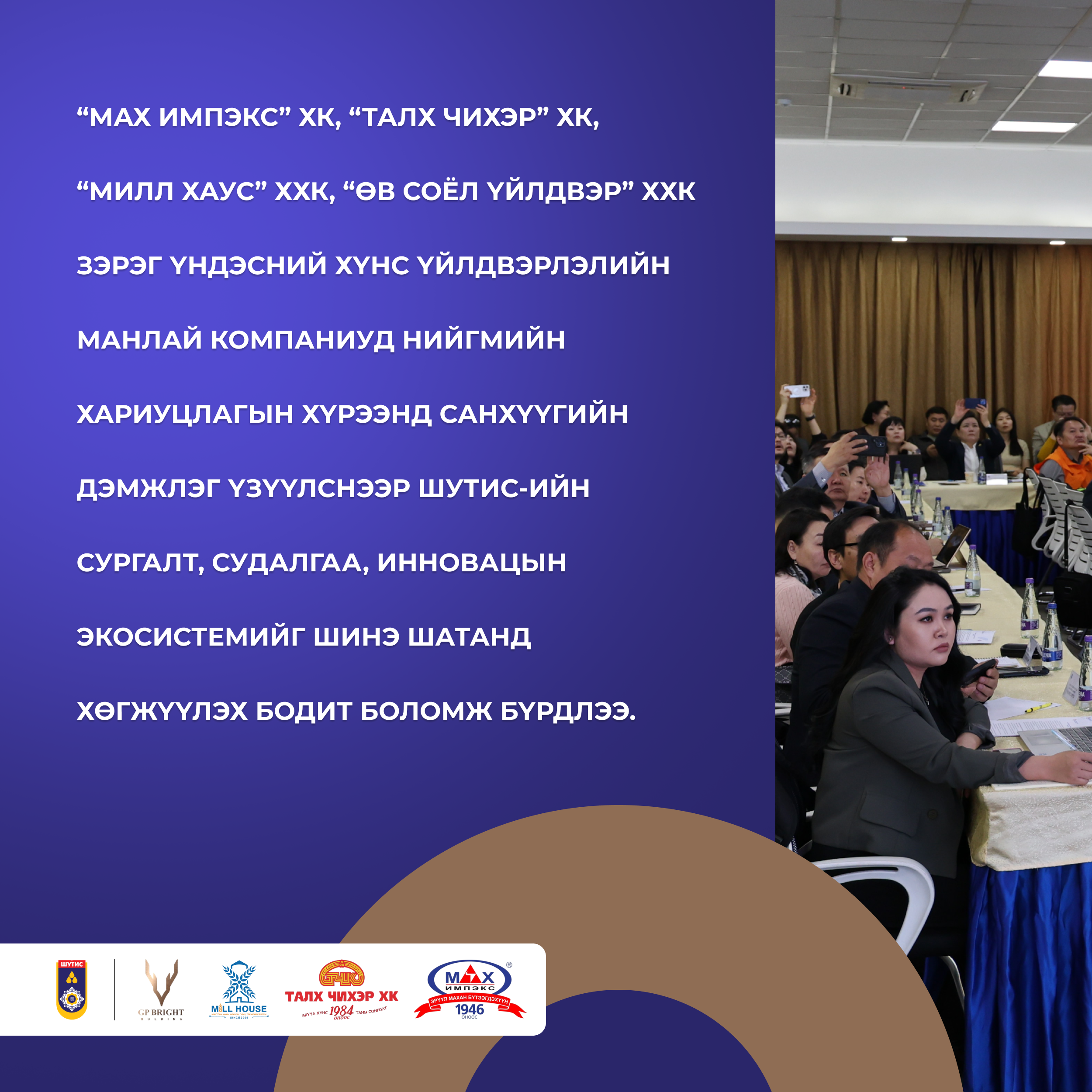 “Мах Импэкс” ХК, “Талх Чихэр” ХК, “Милл Хаус” ХХК, “Өв Соёл Үйлдвэр” ХХК -ийн 1 тэрбум төгрөгийн санхүүгийн дэмжлэгийг Судалгаа, инновацын үйл ажиллагааг дэмжих, тэргүүлэх чиглэлээр суралцаж буй оюутнуудад сургалтын төлбөрийн тэтгэлэг олгох, их сургуулийн хөгжлийн бодлого, стратегийн төслүүдийг дэмжих чиглэлд зарцуулах тохиролцоонд хүрэв.